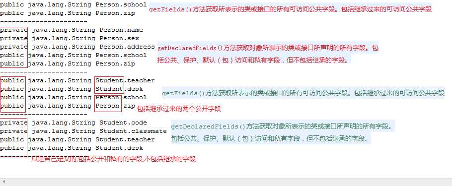 import java.lang.reflect.*; public class Test2 { public static void main(String[] args) throws Exception { Person p = new Person();// 实例化一个父类 Field[] pf1 = p.getClass().getFields();// getFields()方法获取所表示的类或接口的所有可访问公共字段。包括继承过来的可访问公共字段 show(pf1); Field[] pf2 = p.getClass().getDeclaredFields();// getDeclaredFields()方法获取对象所表示的类或接口所声明的所有字段。包括公共、保护、默认(包)访问和私有字段,但不包括继承的字段。 show(pf2); Student s = new Student();// 实例化一个子类 Field[] pf3 = s.getClass().getFields();// getFields()方法获取所表示的类或接口的所有可访问公共字段。包括继承过来的可访问公共字段 show(pf3); Field[] pf4 = s.getClass().getDeclaredFields();// getDeclaredFields()方法获取对象所表示的类或接口所声明的所有字段。包括公共、保护、默认(包)访问和私有字段,但不包括继承的字段。 show(pf4); } // 方便打印的方法 public static void show(Field[] fields) { for (Field f : fields) { System.out.println(f); } System.out.println("----------------------"); } } // 父类 class Person { private String name; private String sex; private String address; public String school; public String zip; } // 子类 class Student extends Person { private String code; private String classmate; public String teacher; public String desk; }