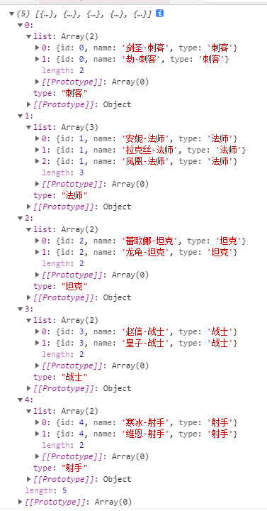 <script type="text/javascript"> groupArr: function (list, field) { var obj = {}; for (var i = 0; i < list.length; i++) { for (item in list[i]) { if (item == field) { obj[list[i][item]] = { list: obj[list[i][field]] ? obj[list[i][field]].list : [], type: list[i].type }; } } obj[list[i][field]].list.push(list[i]) } var att = []; for (item in obj) { att.push({ list: obj[item].list, type: obj[item].type, }) } return att; }, TestDemo: function (LogisticsNumber, ConsigneeNumber) { var list = [{ id: 0, name: "剑圣-刺客", type: "刺客" }, { id: 1, name: "安妮-法师", type: "法师" }, { id: 3, name: "赵信-战士", type: "战士" }, { id: 4, name: "寒冰-射手", type: "射手" }, { id: 4, name: "维恩-射手", type: "射手" }, { id: 2, name: "蕾欧娜-坦克", type: "坦克" }, { id: 1, name: "拉克丝-法师", type: "法师" }, { id: 0, name: "劫-刺客", type: "刺客" }, { id: 1, name: "凤凰-法师", type: "法师" }, { id: 3, name: "皇子-战士", type: "战士" }, { id: 2, name: "龙龟-坦克", type: "坦克" }] var that = this; console.log(that.groupArr(list, ‘id‘)) }, </script>