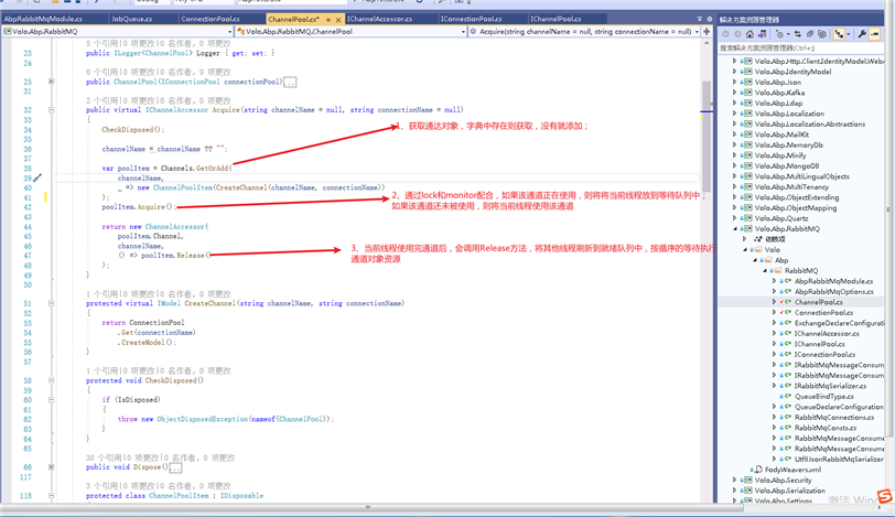 可应用于池类对象忙碌排队操作;如线程池、链接池、管道池。以下代码截图是abp vnext队rabbitmq得通道池得封装;