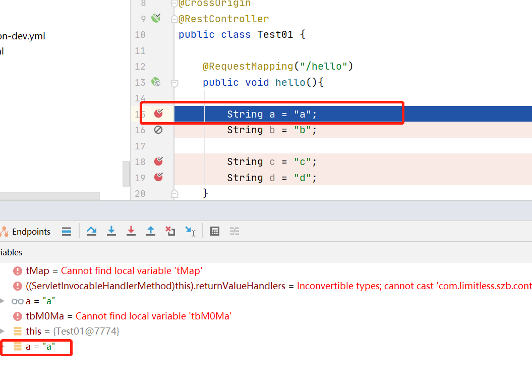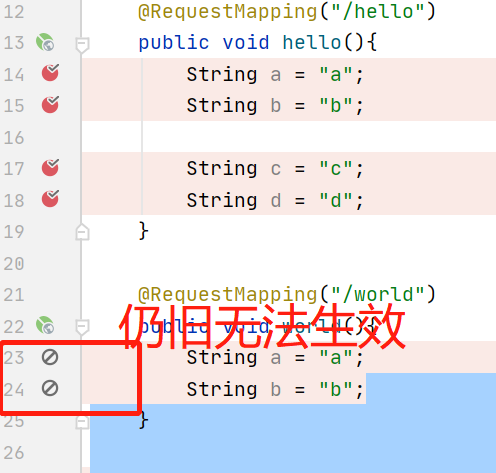 此时 String a = "a"和 String b = "b"的断点全部失效 因为服务器上的17 18两行都是无法打断点的