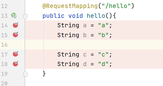 以上,springboot项目启动后,打了三个断点, 位于14 15 18 行 ,其中18行没有可执行的代码所以断点被禁用 呈灰色
