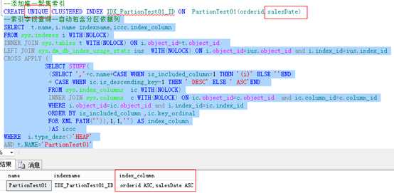 测试一:对于非唯一聚集索引分区时,若未在聚集键明确指定分区列,默认将在聚集索引键列表中添加分区依据列