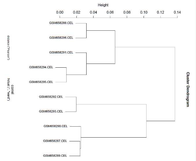 "GSM658288.CEL" ## 2 --------| "GSM658296.CEL" ##10 --------| "GSM658291.CEL" ## 5 "GSM658294.CEL" ## 8 --| "GSM658295.CEL" ## 9 --| "GSM658292.CEL" ## 6 ----| "GSM658293.CEL" ## 7 ----| "GSM658290.CEL" ## 4 -------| "GSM658287.CEL" ## 1 -----|_| "GSM658289.CEL" ## 3 -----|