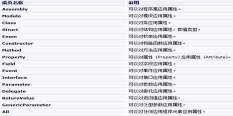 ValidOn属性:获取一组值,这组值标识指示的属性可应用到的程序元素。此属性是AttributeTargets类型的枚举,可取如下值: