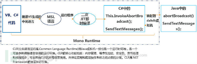 在.NET Framework中编写的应用程序的源代码(比如Visual Basic或者C#)最初被编译为一种名为MSIL的中间语言。该初始编译由特定于语言的命令行编译器(Visual Studio或者其他生成工具)来执行。而当执行应用程序时通常会执行二次编译。二次编译将会获取中间语言并将其编译为可在操作系统中运行的可执行代码。二次编译被称为JIT(just-in-time,即时)编译,在其发布的时候会包含一个mono runtime。