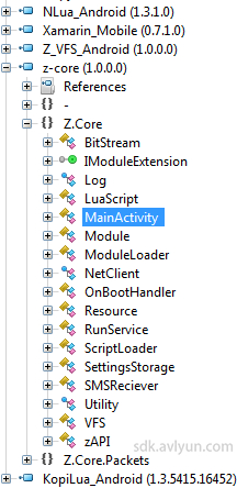 Mono插件会将编写主要代码编译成dll文件并封装到so文件里,之后通过ida进行动态dump,除了程序封装前的五个文件,依次是” Xamarin_Mobile.dll “、”Z_VFS_Android.dll “、“KopiLua_Android.dll”、” NLua_Android.dll”、” z-core.dll “,前两个文件为Mono运行库而后两个为Lua脚本依赖库,其中” z-core “文件则是核心程序代码。下面将对z-core.dll文件进行详细分析。