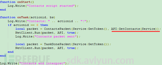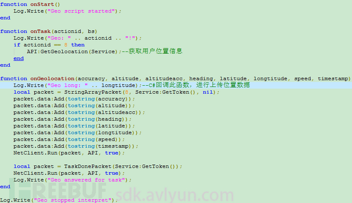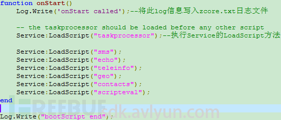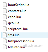 以上函数就是通过lua引擎(LoadScript函数)载入相关的lua文件,这里会依次调用taskprocessor.lua、sms.lua、echo.lua、teleinfo.lua、geo.lua、contacts.lua、scripteval.lua中的函数。