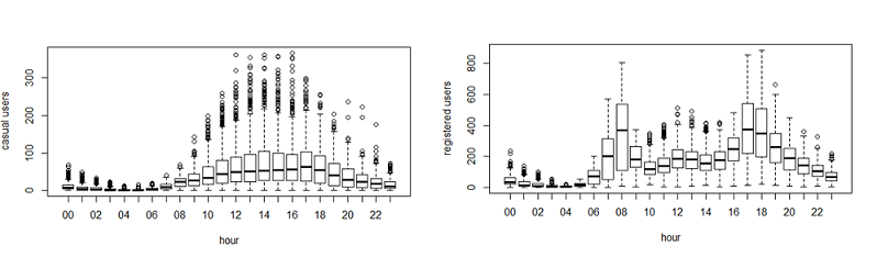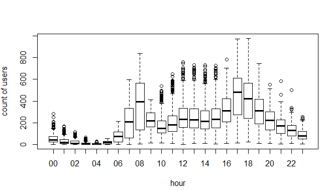 train=data[as.integer(substr(data$datetime,9,10))<20,] test=data[as.integer(substr(data$datetime,9,10))>19,] boxplot(train$count~train$hour,xlab="hour", ylab="count of users")