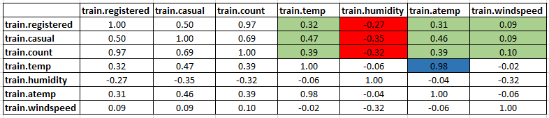 It is clearly satisfying our hypothesis.sub=data.frame(train$registered,train$casual,train$count,train$temp,train$humidity,train$atemp,train$windspeed) cor(sub)