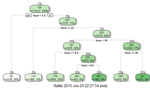 library(rpart) library(rattle) #these libraries will be used to get a good visual plot for the decision tree model. library(rpart.plot) library(RColorBrewer) d=rpart(registered~hour,data=train) fancyRpartPlot(d)