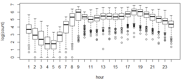 boxplot(log(train$count)~train$hour,xlab="hour",ylab="log(count)")
