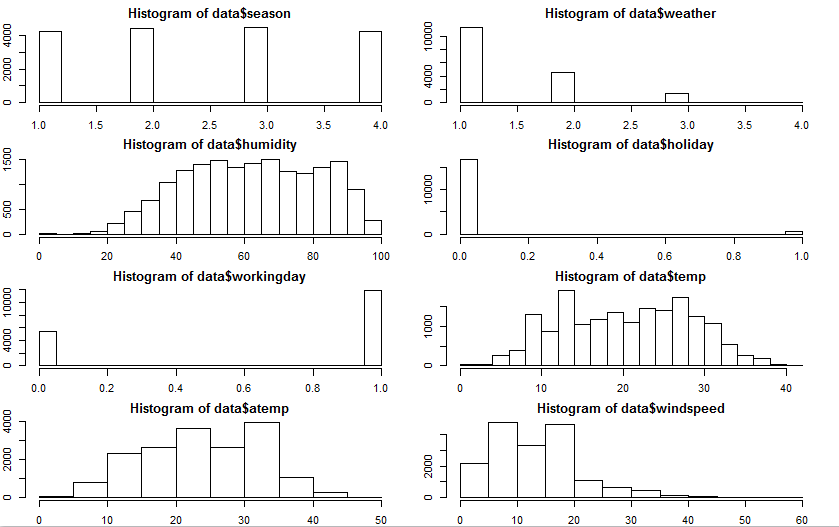 par(mfrow=c(4,2)) par(mar = rep(2, 4)) hist(data$season) hist(data$weather) hist(data$humidity) hist(data$holiday) hist(data$workingday) hist(data$temp) hist(data$atemp) hist(data$windspeed)
