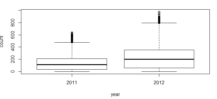 data$year=substr(data$datetime,1,4) data$year=as.factor(data$year) train=data[as.integer(substr(data$datetime,9,10))<20,] test=data[as.integer(substr(data$datetime,9,10))>19,] boxplot(train$count~train$year,xlab="year", ylab="count")