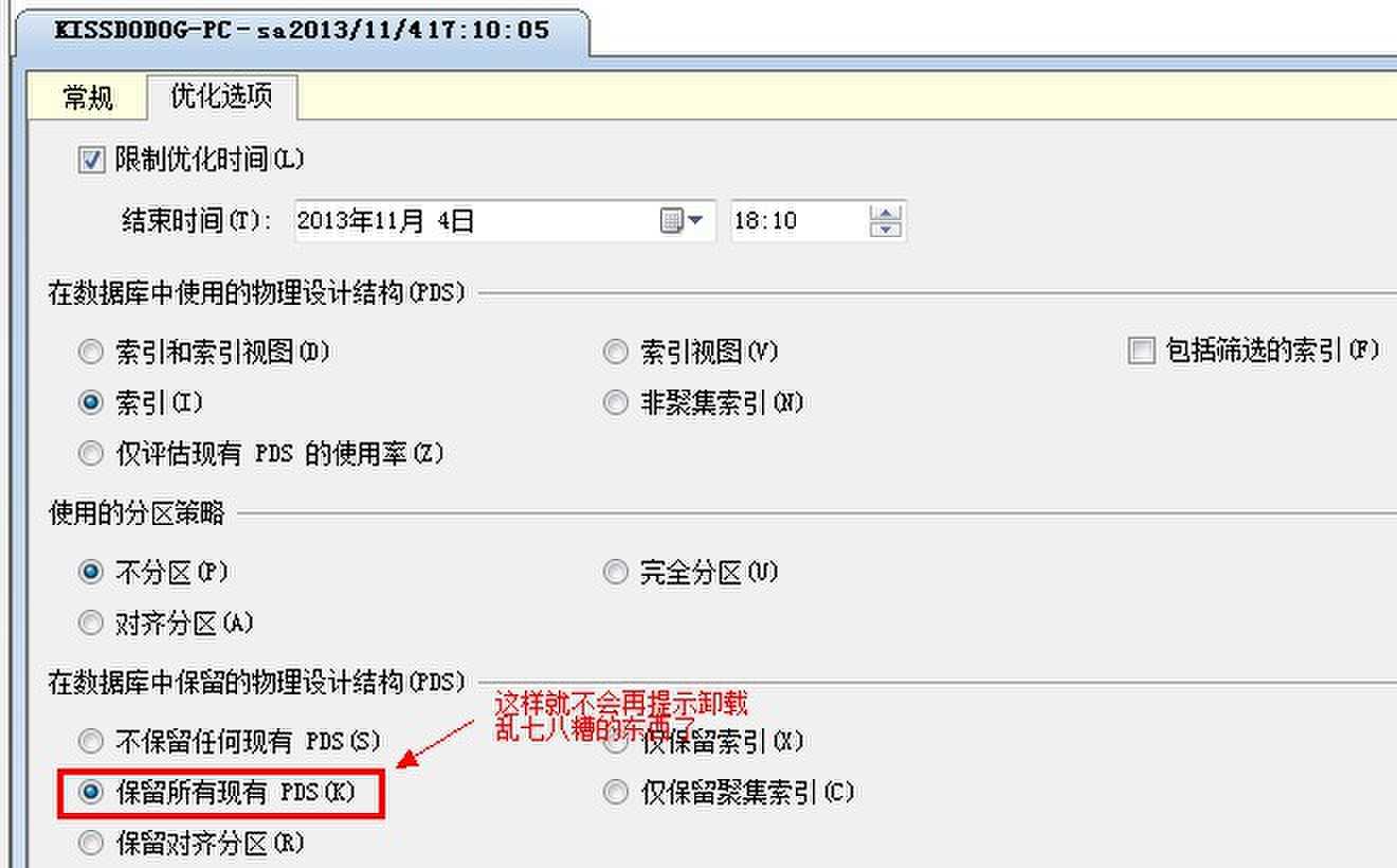 因此,在优化项目里,应该设置数据引擎调整顾问不能卸载任何已有的结构,这个优化选项里把“数据库中保持的物理设计结构”设置“从不保持任何现有的PDS”变为保持现有的PDS。这样就优化顾问就不会建议卸载现有的OBJECT了。
