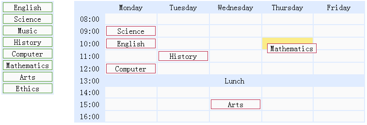 正如您所看到的上面的代码,当用户拖动在左侧的学校科目并放置到时间表单元格中时,onDrop 回调函数将被调用。我们克隆从左侧拖动的源元素并把它附加到时间表单元格上。 当把学校科目从时间表的某个单元格拖动到其他单元格,只需简单地移动它即可。