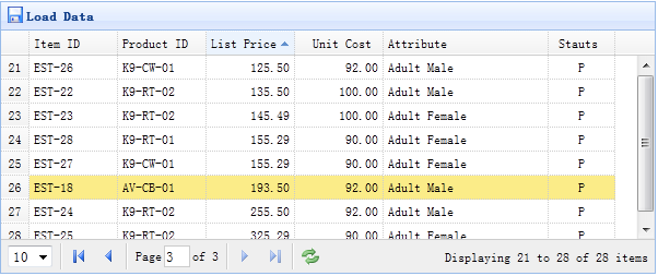 <table id="tt" class="easyui-datagrid" style="width:600px;height:250px" url="datagrid8_getdata.php" title="Load Data" iconCls="icon-save" rownumbers="true" pagination="true"> <thead> <tr> <th field="itemid" width="80" sortable="true">Item ID</th> <th field="productid" width="80" sortable="true">Product ID</th> <th field="listprice" width="80" align="right" sortable="true">List Price</th> <th field="unitcost" width="80" align="right" sortable="true">Unit Cost</th> <th field="attr1" width="150">Attribute</th> <th field="status" width="60" align="center">Stauts</th> </tr> </thead> </table>